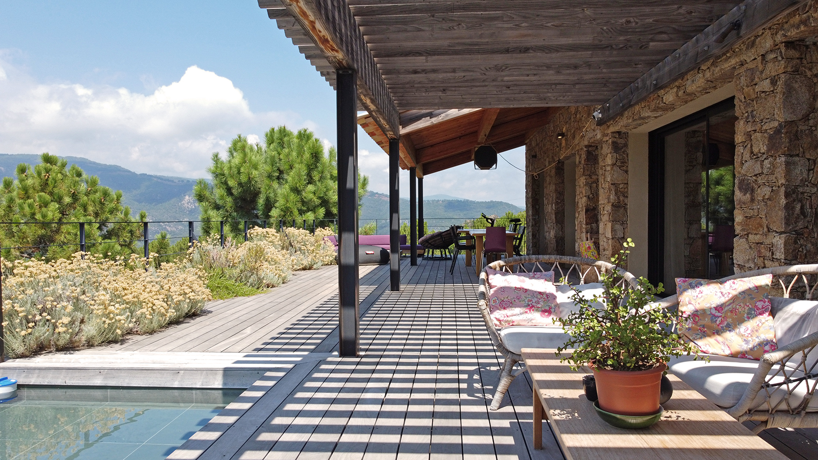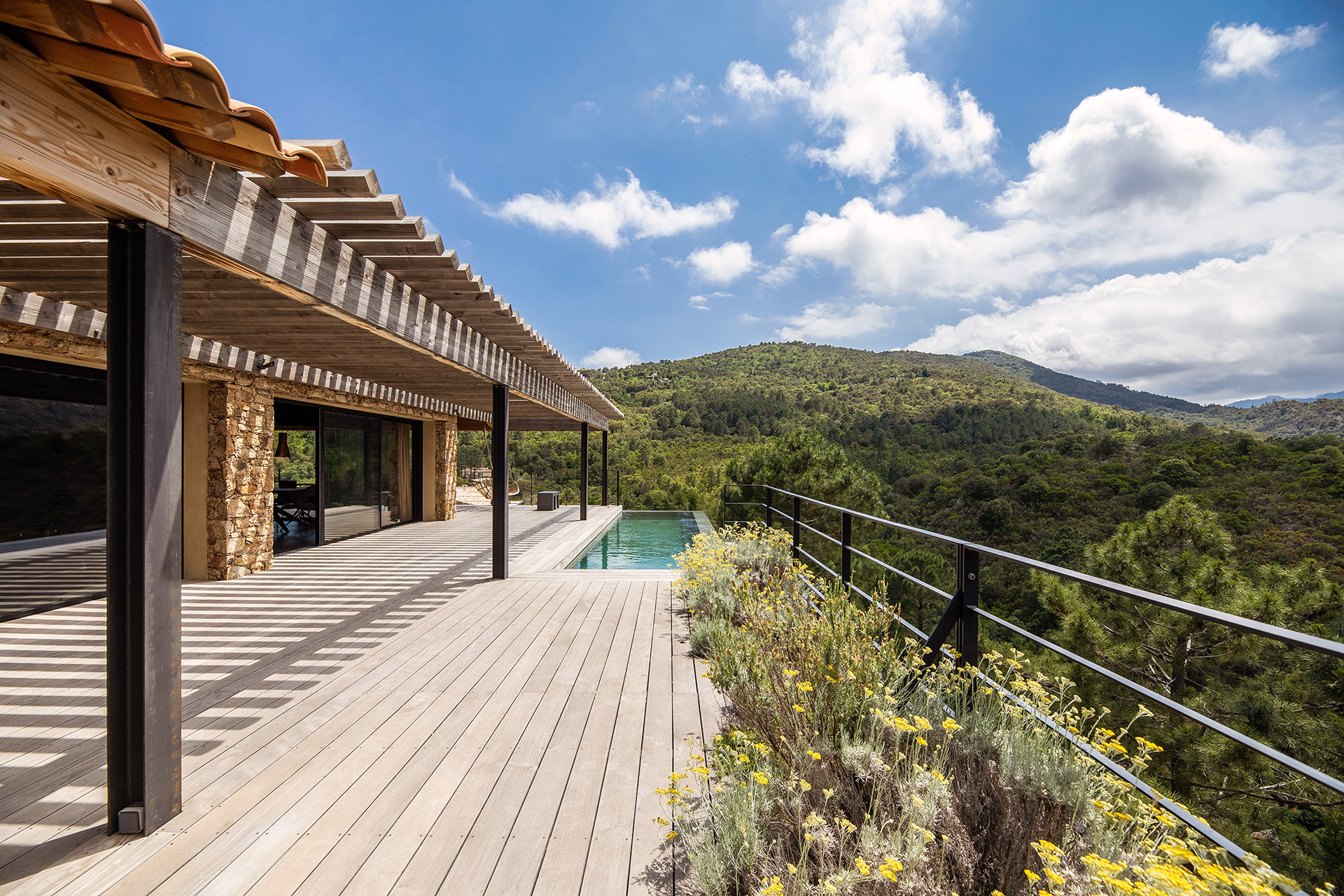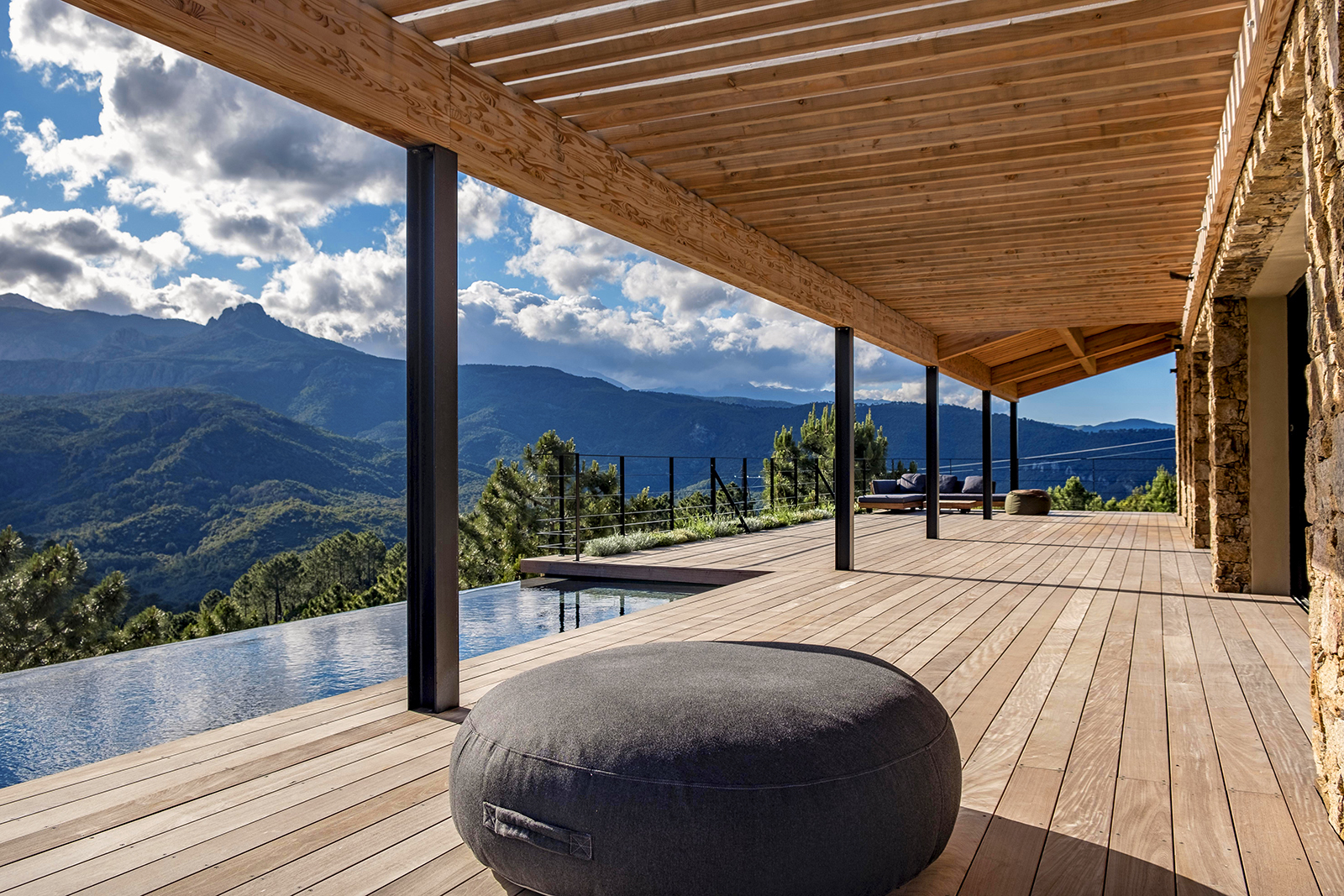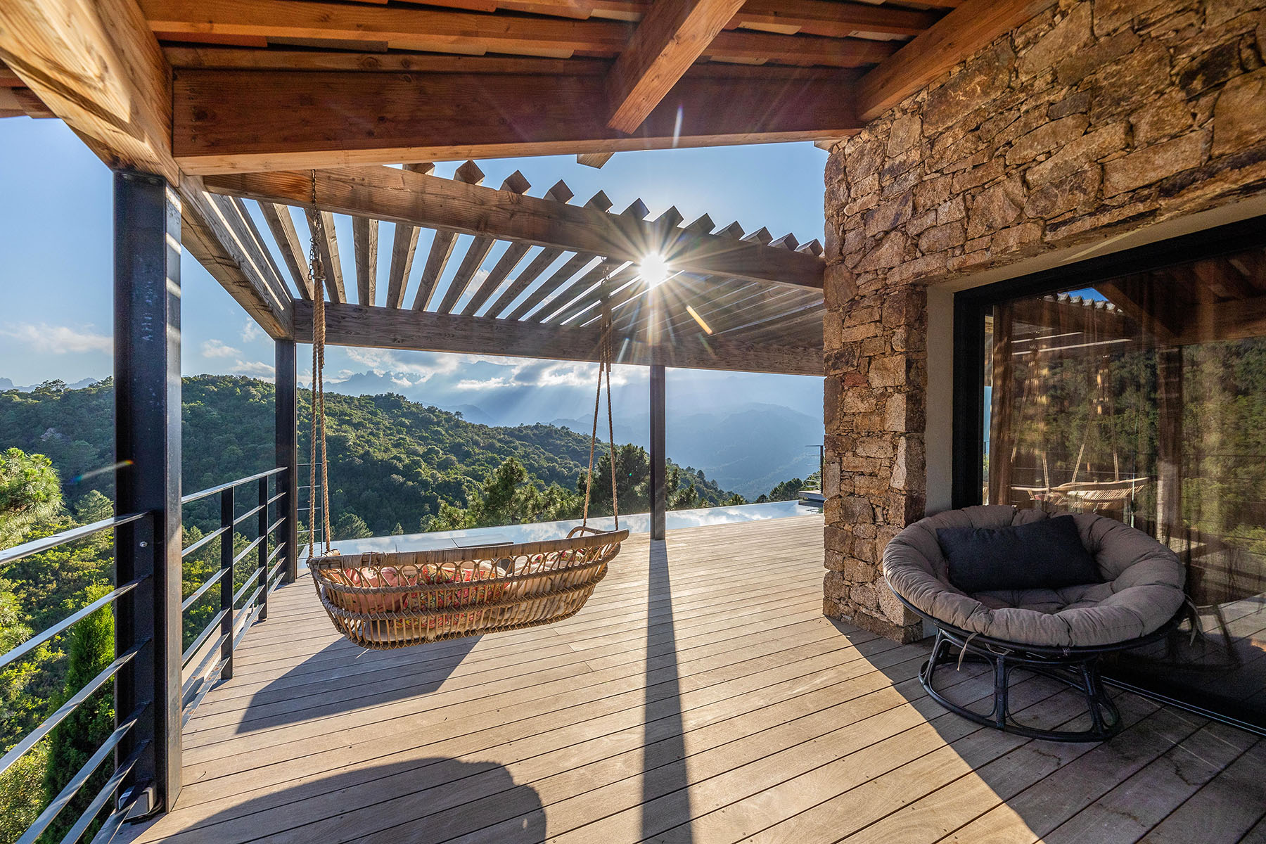 Piscine à débordement et terrasse bois en belvédère offrent une vue exceptionnelle sur les Aiguilles de Bavella à l’Ouest.