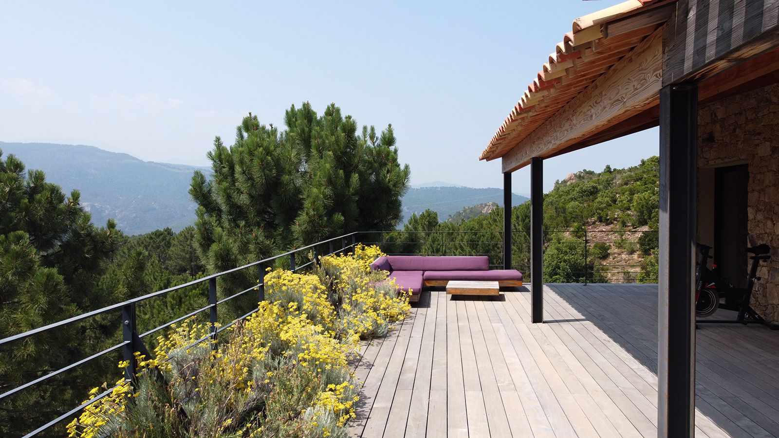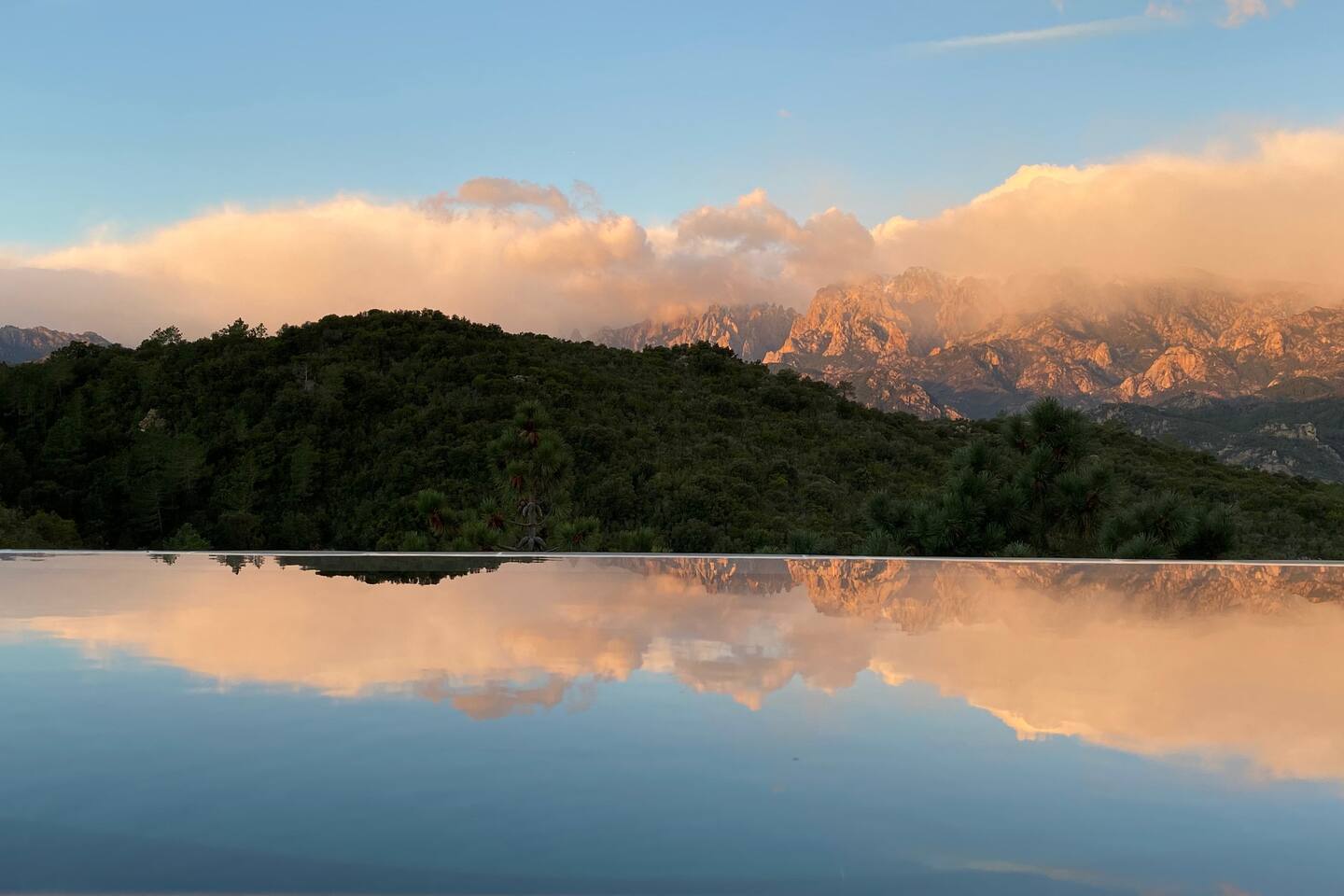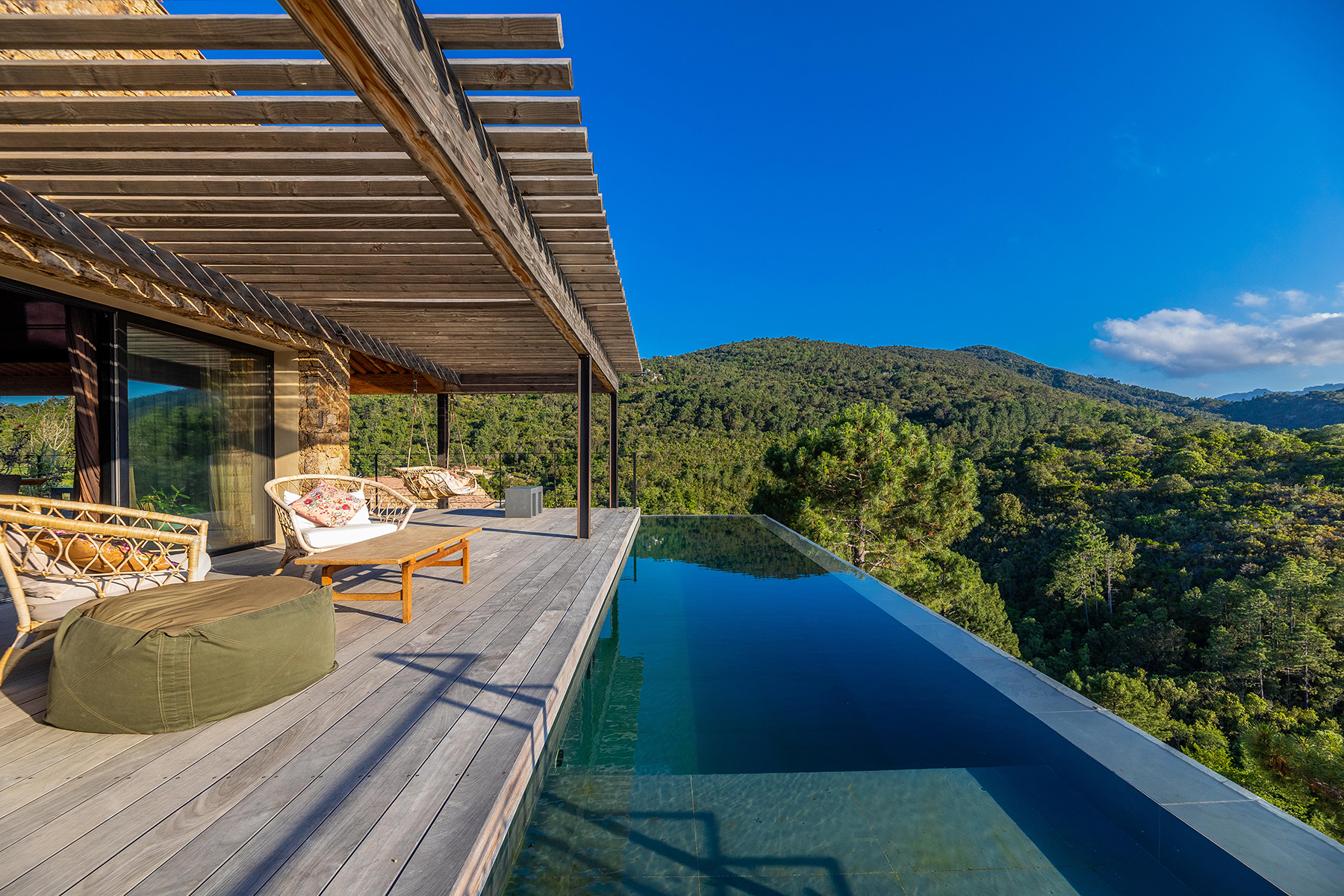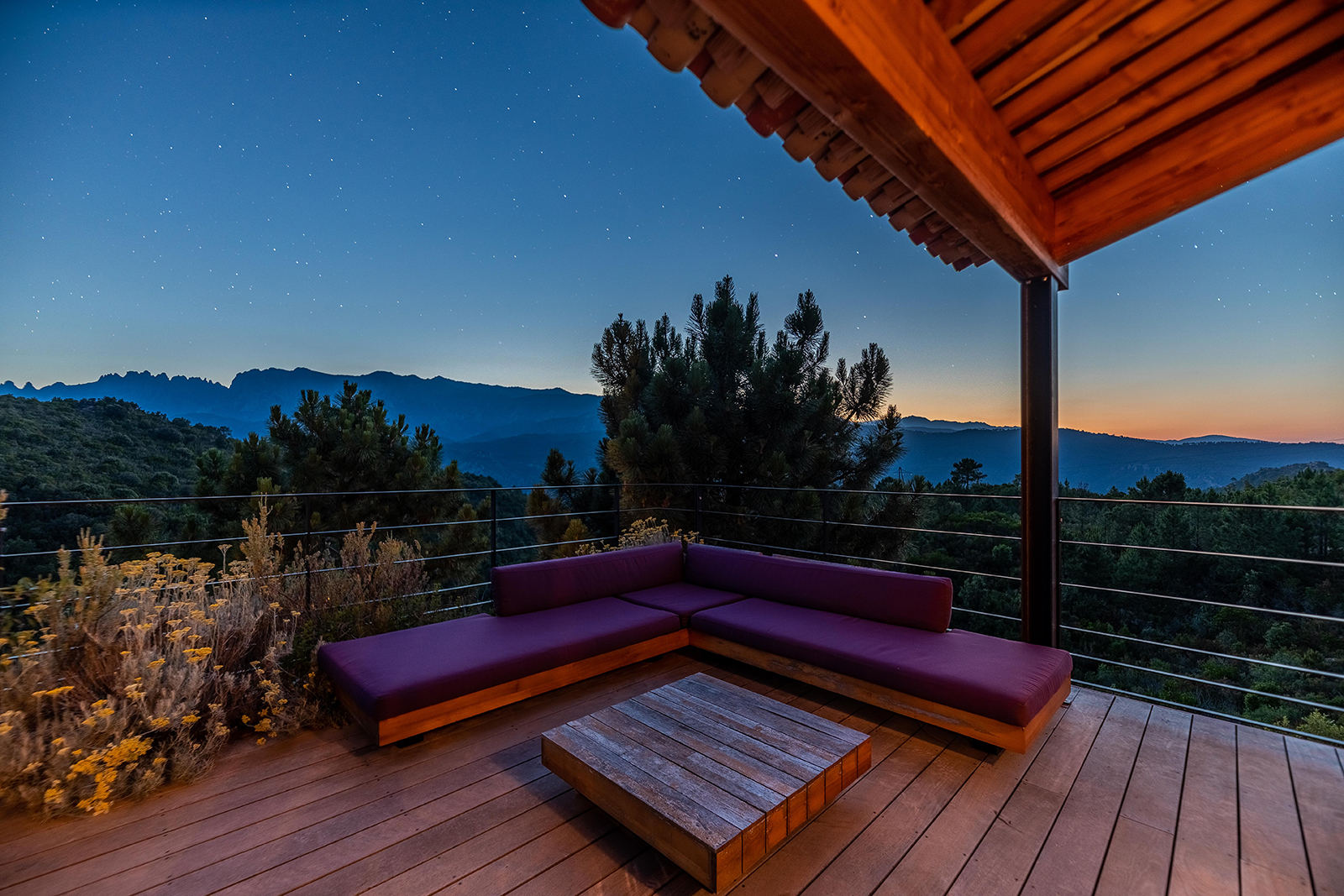 Piscine à débordement et terrasse bois en belvédère offrent une vue exceptionnelle sur les Aiguilles de Bavella à l’Ouest.